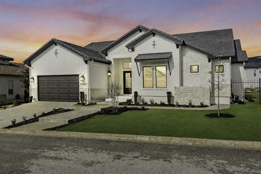 Welcome to a breathtaking custom home built by McNair Custom Homes, nestled in the prestigious The Bluff at The Dominion community. This residence exudes luxury with every detail carefully selected and quality crafted. The home spans a spacious 2,997 square feet, featuring four well-appointed bedrooms and four bathrooms, along with a two-car garage. The exterior boasts an elegant combination of stucco and stone, topped with a durable concrete tile roof. Both the front porch and rear patio are tiled, offering serene spaces for outdoor leisure, all set against the backdrop of a thoughtfully landscaped backyard with an impressive rock wall.